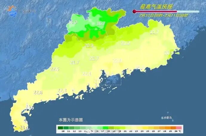 2月10日,粤北、珠三角西部和粤西市县多云间阴天,有分散小雨,其余市县多云。西部部分市县早晨有轻雾。最低气温:粤北和粤东市县9℃—12℃,粤西市县16℃—20℃,其余市县12℃—15℃。