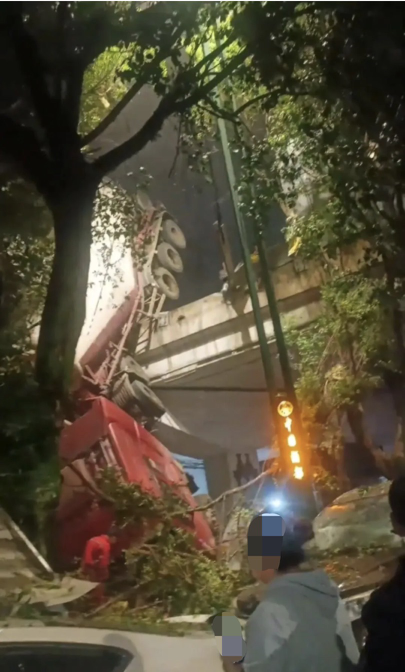 现场视频显示,一辆红色水泥罐车冲出高速桥,倒悬半空。车头朝下,坠落在地面,砸到了路边的车辆,车身还卡在桥上。现场有不少人员围观。
